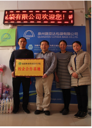 本网讯 12月17号,罗立仪副院长带领艺术设计系曾秀云主任及英语教研室连颖老师一行三人赴泉州,同泉州路亚达包袋有限公司洽谈校企合作事宜,并进行校企合作基地基地授牌仪式。