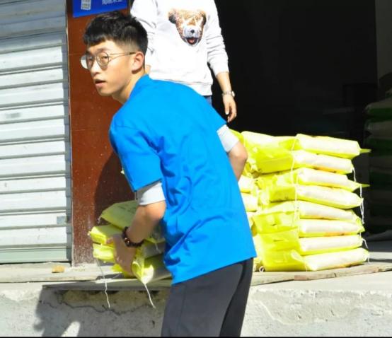 志愿者们在送米过程中任劳任怨,积极担当,务实做一名合格的志愿者。