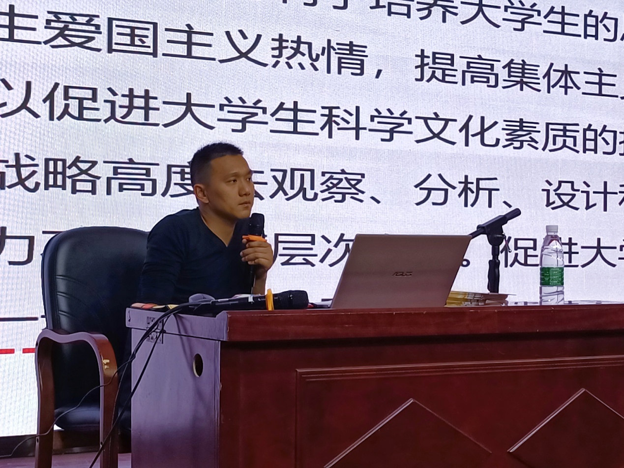 廖士喜老师以“为什么要上这门课?”为中心发表了演讲,告诫我们如今的大学生不能只是“两耳不闻窗外事,一心只读圣贤书”,大学生要立志做有为青年,必心存国家民族。