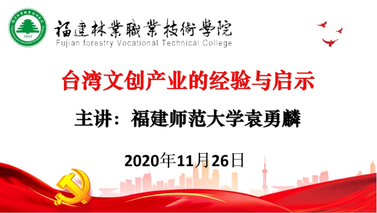 本次艺术传媒系承办的《台湾文创产业的经验与启示》讲座,是福建林业职业技术学院“天麟大讲堂”的系列活动之一。“天麟大讲坛”立足学院“三全育人全面发展实施方案”,着力在全员育人、全方位育人、全过程育人发挥积极的作用。