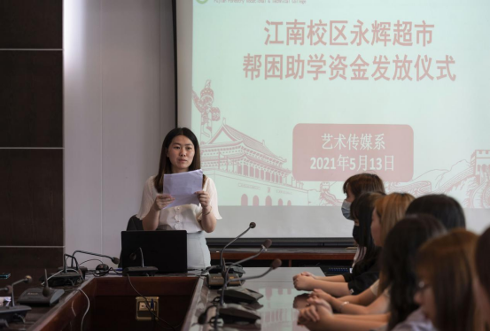 接着,江南校区永辉超市项目负责人冯挺辉、现场经理叶承涛先生代表江南校区永辉超市,向17位艺术传媒系的贫困生及“小太阳”少儿公益兴趣班授课同学一一发放了帮困助学金,总金额达2.6万元。