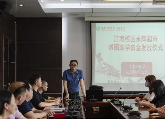 2021年5月13日下午3:00,艺术传媒系在天麟校区综合楼六楼会议室举行福建林职院江南校区永辉超市帮困助学资金发放仪式。仪式由艺术传媒系学生科科长兼团总支书记叶章球主持。艺术传媒系党总支书记陈政、系主任曾秀云、江南校区永辉超市项目负责人冯挺辉、现场经理叶承涛出席了本次发放仪式。