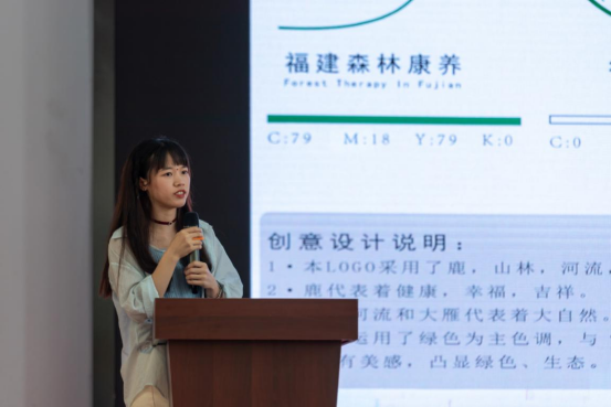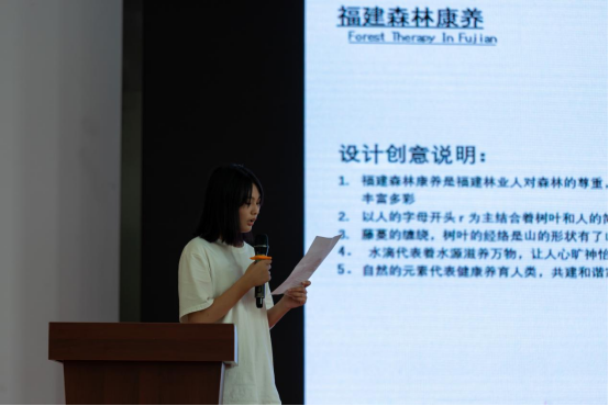 选手根据自身设计思路以及福建森林康养品牌logo设计内涵展开解说,设计说明精炼简短、突出中心思想,参赛选手们都表达出自己独特的设计风格。台下评委老师们秉着公平公正的原则进行现场评分。赛项满分为100分,采用过程评价与结果评价相结合、能力评价与职业素养评价相结合,二者同时进行,都为比赛结果的评判标准。经过评委们的讨论后,在此恭喜