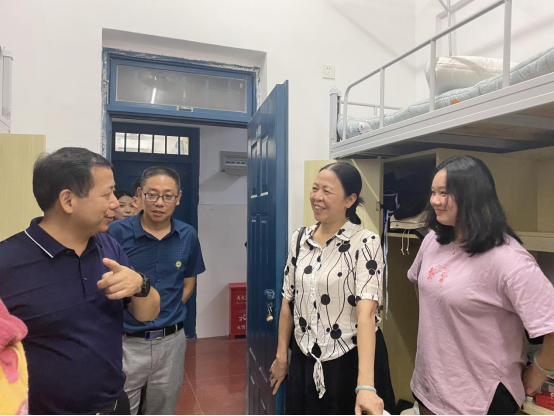 新学期伊始,为进一步做好学院常态化疫情防控工作,落实好学生新宿舍搬迁和宿舍安全管理工作,2021年9月4日、5日,院长刘文开、副院长罗立仪带领艺术传媒系党总支书记陈政、系主任曾秀云、学生科长兼团总支书记叶章球以及全体辅导员分别走访了艺术传媒系江南校区、天麟校区的学生宿舍,为学生送去关心和问候。