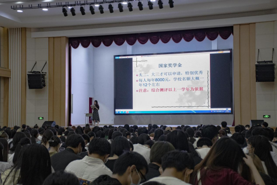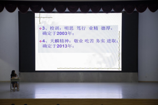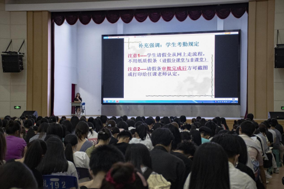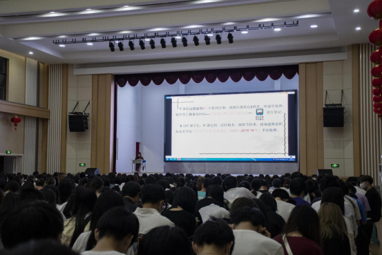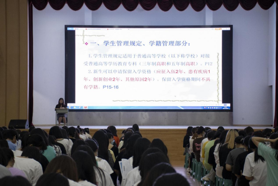 在介绍完学院历史后,叶科长为大家讲解了学校的《学生管理规定》与《学籍管理部分》,详细地为学生讲解了学籍管理、考勤制度、纪律处分、奖惩制度、奖学金等级和评定条件等内容。为了帮助大家熟悉请假制度,详细说明了请假手续流程,同时强调尽量不事后补假,补假时间一周为限,一学期请假次数超过总学时三分之一及以上将作休学处理,不休学者做退学处理,并严肃说明了退学的情况与危害,以此警醒大家。通过讲解国家奖学金和国家励志奖学金评定情况,鼓励在校学生努力学习,做一名品学兼优的学生。