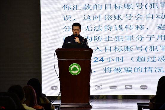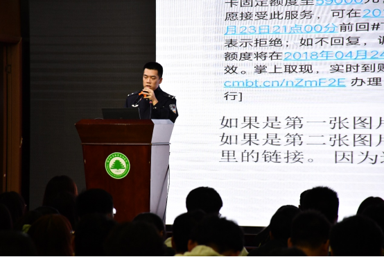 讲座过程中,黄警官以网络贷款类诈骗、信用卡提额诈骗、网络交友诈骗、“淘宝刷单”类诈骗、网络购物退款诈骗、网络交易类诈骗、诱使关机实施诈骗、冒充熟人诈骗、冒充“公检法”诈骗、出售考试作弊工具或答案类诈骗这十种不同的诈骗形式为同学们逐步讲述了网络电信诈骗的严重性。