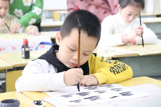 在书法班上,志愿者老师耐心细致地从书法入门开始讲起,展示握笔姿势,示范“点、横、竖、撇、捺”的运笔方法。小朋友们挺直身板专心听讲,手握毛笔端坐在课桌前认真临摹。助教们握着他们的小手纠正握笔姿势,耐心指导,反复练习,一撇一捺都透露着书法艺术的独特魅力。