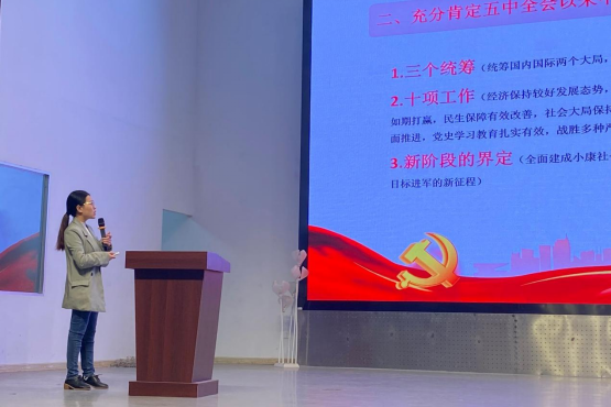 第一阶段,叶章球科长对党的十九届六中全会进行介绍,为大家讲述了党的十九届六中全会四项重要内容且充分肯定五中全会以来中央政治局的工作。详细讲解了三个统筹,即统筹国内国际两个大局,统筹疫情防控和经济社会发展,统筹发展和安全;十项工作:为经济保持较好发展态势,科技自立自强积极推进,改革开放不断深化,脱贫攻坚战如期打赢,民生保障有效改善,社会大局保持稳定,国防和军队现代化扎实推进,中国特色大国外交全面推进,党史学习教育扎实有效,战胜多种严重自然灾害与新阶段的界定:全面建成小康社会,激励全党全国各族人民意气风发踏上向第二个百年奋斗目标进军的新征程。