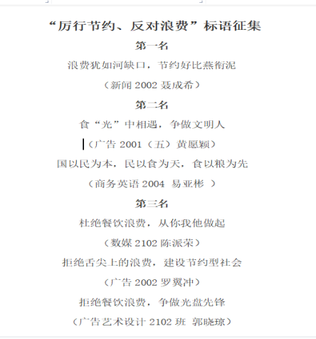 艺术传媒系面向全体艺术传媒系学生征集拒绝浪费的标语,从思想上坚决对“舌尖上的浪费”说不。传承美德,做简朴俭约的传承者;抵制浪费,做节约粮食的示范者;以身作则,做文明新风的践行者。