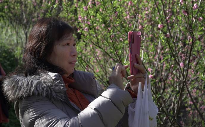 钻进桃花深处,老师们有的拿出手机记录这眼前的美景,有的要与这桃花林合个影。