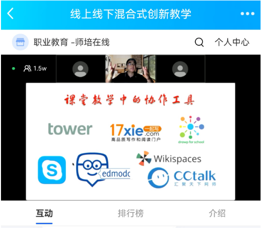 7日晚,焦建利教授的《线上线下混合式创新教学》为我们总结了混合学习的五种策略:参与、协作、翻转、测评与沟通,还现场为我们展示了利用“击鼓传花”“抢答”等模式与学生进行线上互动,提高学生的参与度。