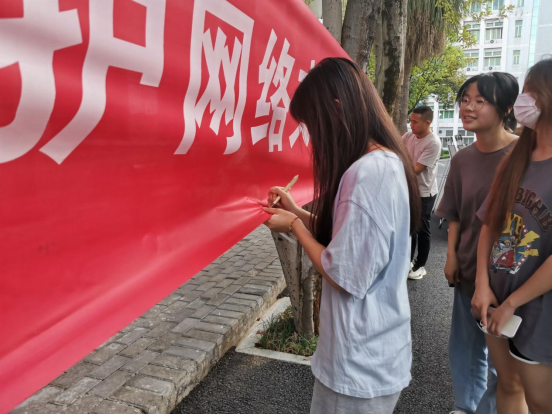海报活动现场,不少同学表示有所感悟,他们相互探讨本次活动心得体会。签名活动现场也取得热烈反响,同学们纷纷在条幅中签上自己的名字,表达着对“网络同心 文明同行”的责任与担当,为学校营造良好的网络文明文化氛围献出自己的一份力。