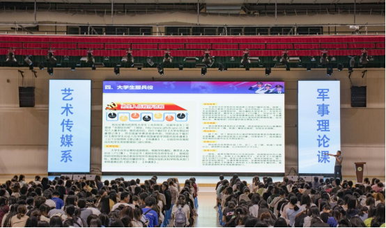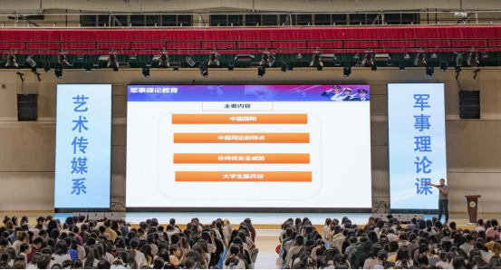 为进一步提升2022级新生军事综合素质,增强同学们对军事知识的了解与认识,弘扬和传承爱国主义精神,2022年9月26日晚上七点,艺术传媒系在江南体育馆一楼举行以军事理论及形式与政策教育为主题的2022级新生入学教育讲座。系学生科科长兼团总支书记廖士喜担任主讲老师。