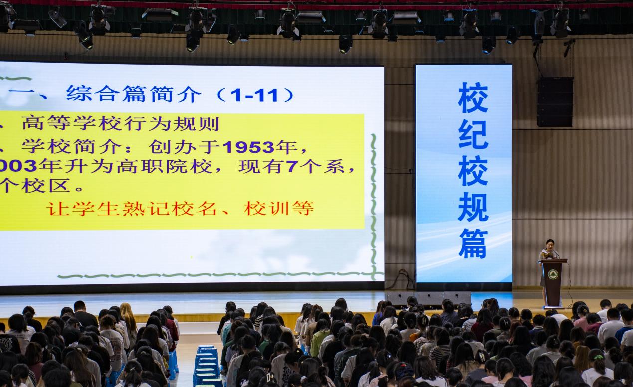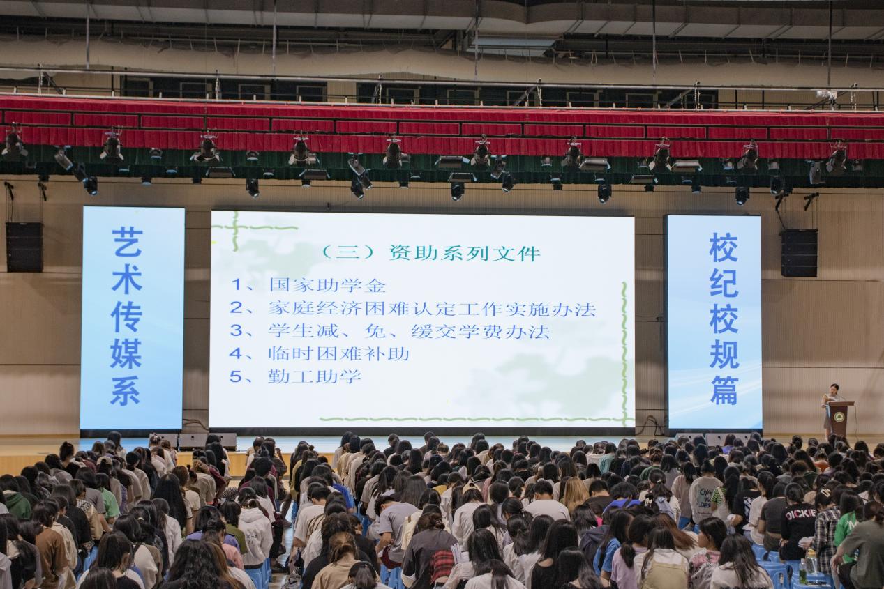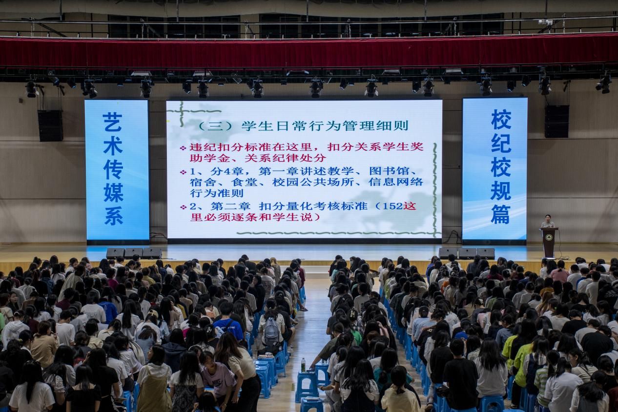 2022年9月26日晚,艺术传媒系于江南体育馆举办以校纪校规及学生管理制度教育为主题的2022级新生入学教育讲座。系党总支副书记叶章球老师担任主讲,系学生科科长兼团总支书记廖士喜、新生辅导员及2022级全体新生到场聆听。