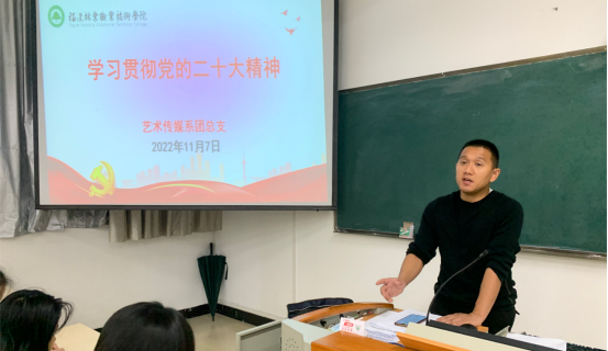 为了深入学习贯彻党的二十大精神,加强团员信念感与使命感,2022年11月7日晚上七点,艺术传媒系学生科科长兼团总支书记廖士喜在江南校区教学楼205教室召开团员大会,讲授《党的二十大报告要点》专题团课。艺术传媒系团员学生参与本次学习。
