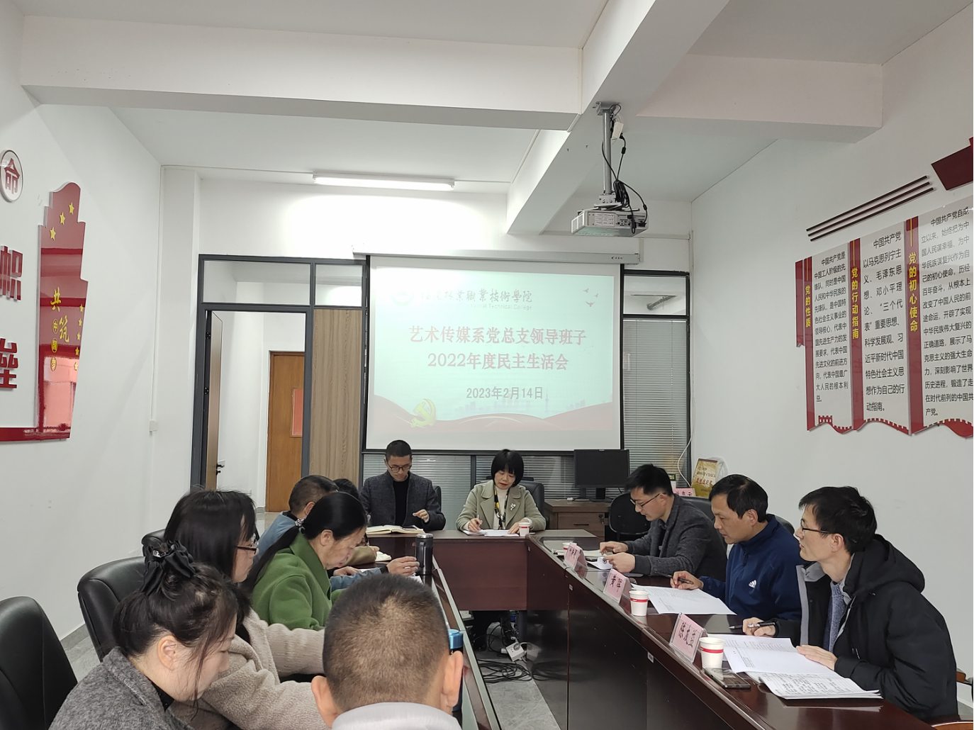 2023年2月14日上午,艺术传媒系党总支召开2022年度领导班子民主生活会。学院副院长黄晖、院团委书记陈友益、建筑工程系党总支专职组织员叶新颖到会督导。艺术传媒系党总支委员、副科级以上干部参加会议。会议由系党总支书记陈政同志主持。
