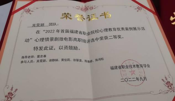 热爱尝试、勇于创新的她,深知自己所积累的学识不足,面对学业和学生干部工作,吴雯颖同学表示:只有成为“时间管理大师”方能不负韶华,用自律、拼搏浇灌热爱,以真诚、热烈书写年华。她不仅在学业上获得成长提升,更在实践中斩获荣誉无数。在校期间,她先后于2022年4月荣获福建林业职业技术学院“禁毒宣传大赛(绘画组)”三等奖、2022年5月荣获福建林业职业技术学院“健康由心开始,生命因你绽放”心理微电影二等奖;同时她也代表学校参加多项省赛,并于2022年9月荣获“2022年首届福建省职业院校心理教育优秀案例展示活动”心理情景剧微电影高职组二等奖、“2022年首届福建省职业院校心理教育优秀案例展示活动”心理情景剧剧本创作高职组三等奖以及2022年11月荣获“福建省商务谈判大赛”专科组二等奖等多项荣誉。