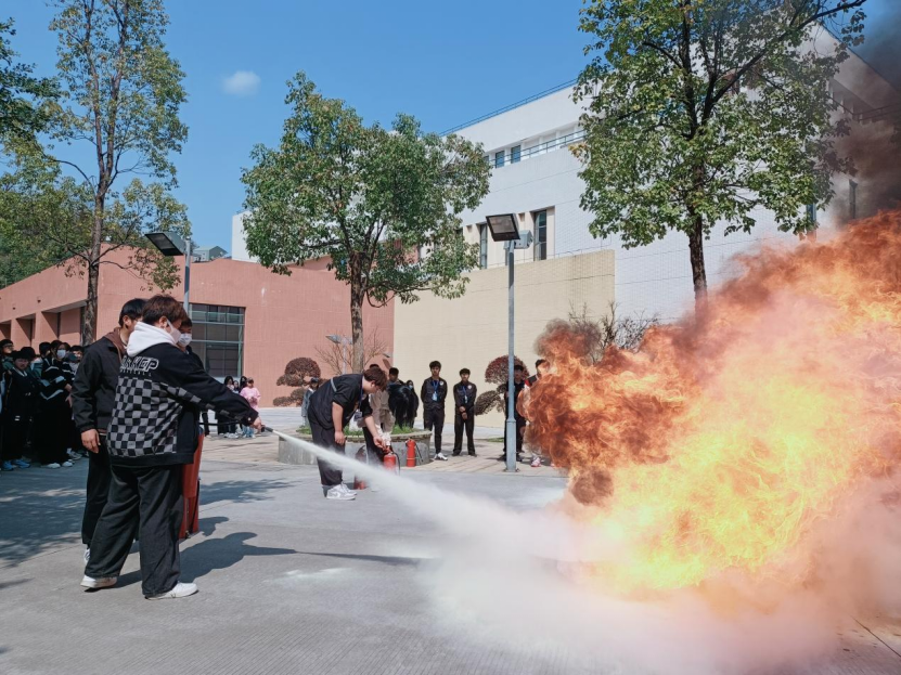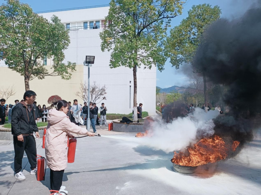 随后,艺术传媒系系学生科科长兼团总支书记廖士喜老师给全体同学详细讲解了灭火器的使用方法。在认真听讲并仔细观摩后,部分同学也亲自体验了现场灭火过程,面对熊熊燃烧的火堆,他们表现得十分积极勇敢,冷静地按照灭火步骤并根据指导按住灭火器将大火迅速扑灭。廖士喜老师强调一旦身边发生突发事件,要沉着应对,做好及时报告和安全逃生工作,有效掌握在危险环境中迅速逃生、自救、互救的基本方法,切实提高抵御和应对紧急突发事件的能力。