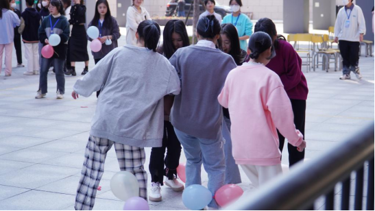 接着是“气球大作战”。比赛分为两个队伍,每个队伍每个人的脚上绑上2个气球,当主持人哨声吹响后,比赛开始,双方在保护己方气球的同时需要踩破敌队的气球。系党总支书记陈政老师也与同学们一同参与游戏中,在你追我踩的场景下,与同学们玩得乐此不疲,体现了亦师亦友、和谐融洽的师生关系。