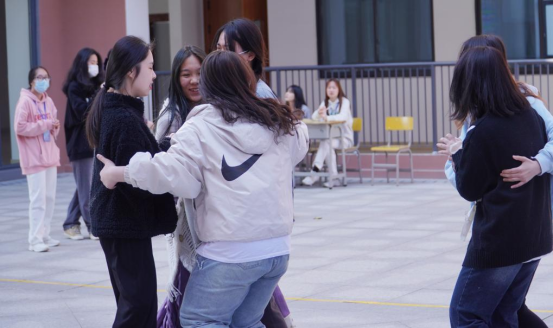首先进行的是“桃花朵朵开”。以20个人为一组,围成一个圈,向左或向右跑起来,主持人在游戏开始时说:“桃花桃花朵朵开”,全体队员接着说:“开几朵”,主持人随机说一个数字队员迅速分散,按数字组队,落单人员淘汰出局。同学们伴随着音乐手牵着手像一朵朵盛开的花朵,紧张又刺激的气氛油然而生。当主持人报出数字,同学们迅速按照数字抱成一团,随之发出欢呼声、感叹声。