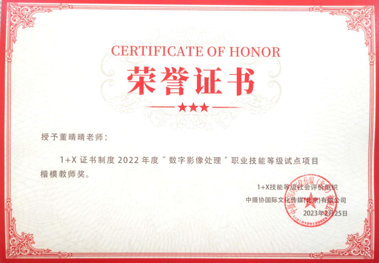 在近期召开的“1+X数字影像处理职业技能等级证书2022成果表彰会暨2023年工作线上说明会”上,我院被评为“2022年度1+X数字影像处理职业技能等级证书项目先进试点院校”,艺术传媒系董晴晴老师荣获“2022年度1+X数字影像处理职业技能等级证书试点项目楷模教师”称号,吴娅坤老师荣获“2022年度1+X数字影像处理职业技能等级证书试点项目优秀指导教师”称号。