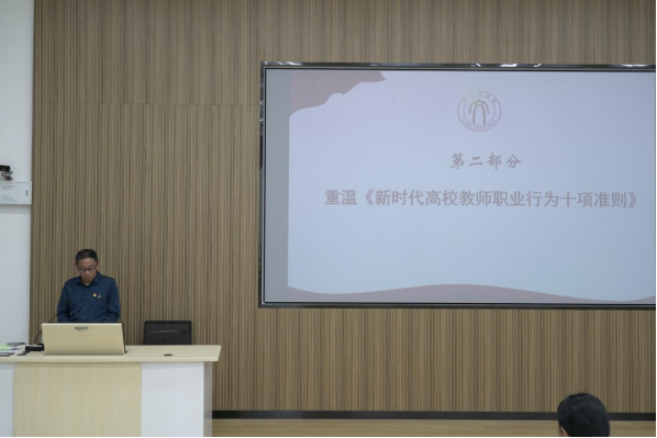 接着,系党总支书记陈政带领全体教职工重温了《新时代高校教师职业行为十项准则》的内容。要求全体教职工认真学习和严格遵守《新时代高校教师职业行为十项准则》,规范教师教育教学行为,坚守行为底线,加强自我修养,争做“四有”好老师,争做学生“四个”引路人。