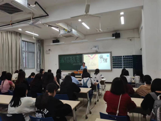 廖老师还针对如何实行“诚信教育”做出了表述:要以学生为主体组织丰富多彩的教育活动,诚信教育的重点在于知行合一,要与传统美德教育相结合,在加强诚信教育的同时,还要加强遵守法律法规的意识、校规校纪和社会公德的教育。