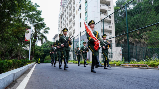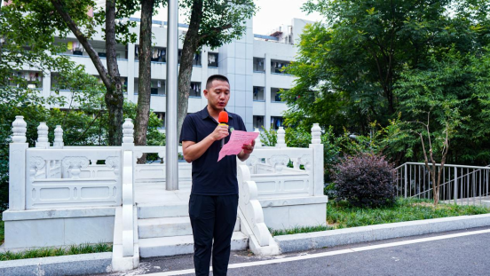 国旗手踏着正步有力前行,护送着国旗走向国旗台,五星红旗在雄壮庄严的《义勇军进行曲》中缓缓升起。升旗仪式结束后,艺术传媒系学生科科长兼团总支书记廖士喜围绕《安全生产月》主题进行国旗下讲话。