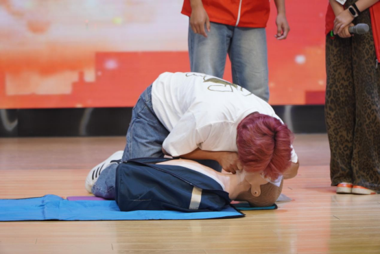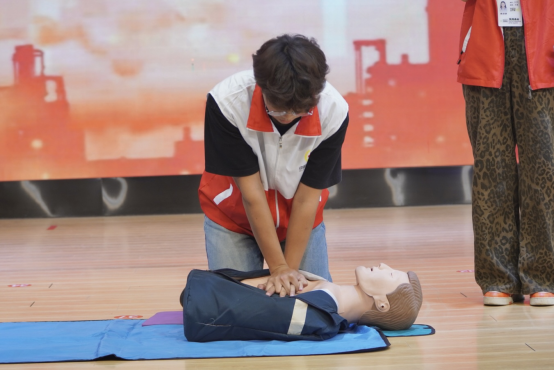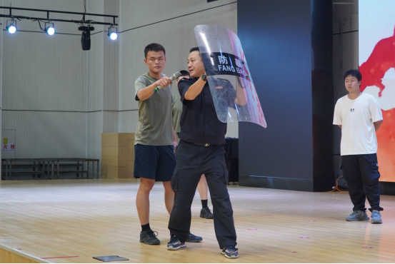 安保处安保队张队长详细展示了防爆盾的使用方法及技巧,并通过模拟歹徒进入校园的场景,演示了防爆盾的单人操作要点。他强调,遇到突发事件应优先撤离报警,保证自身安全,切忌盲目逞强或个人英雄主义。随后,红十字会工作人员为大家带来心肺复苏的专业讲解与实操示范,通过分步演示人工呼吸和胸外按压等关键动作,帮助同学们初步掌握这一急救技能,进一步提升大家在紧急情况下的自救与互救能力。
