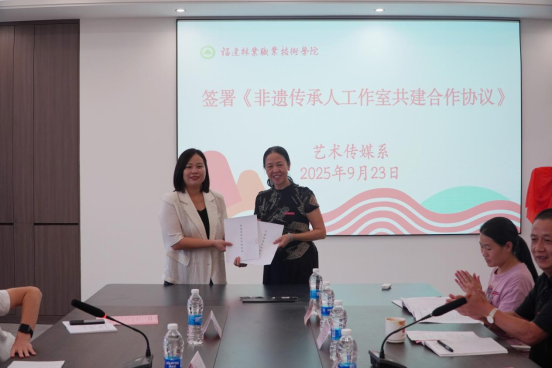 仪式的核心环节——签约与揭牌,将现场气氛推向高潮。福建林业职业技术学院艺术传媒系主任曾秀云分别与松溪县委宣传部副部长高钦钦签署《非遗传承人工作室共建合作协议》,与松溪县融媒体中心副主任祝晓峰签订《实践教学基地协议书》。两份协议的签署,超越了文书本身,成为校地双方“共育文化新人”的庄严承诺。