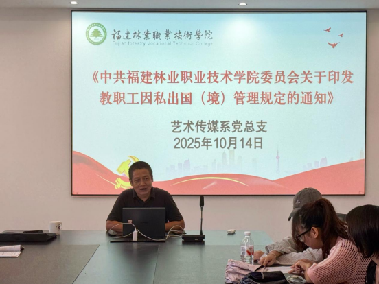 随后,会议学习《中共福建林业职业技术学院委员会关于印发教职工因私出国(境)管理规定的通知》。范有福书记详细解读登记备案、审批流程、证件管理等重点条款,明确非登记备案人员因私出国(境)的报备要求,要求全体教师严格遵守纪律,按规定办理请假与备案手续,确保因私出国(境)管理规范有序,维护学院正常教学秩序与安全稳定。