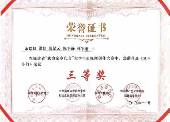 11月29日,2025年福建省“新农人”风采展示活动暨“我为家乡代言”大学生短视频创作大赛在福州大学城文化艺术中心举办。我系学子凭借其深入乡村、视角独特的作品《延平乡韵》在众多参赛作品中脱颖而出,荣获大赛三等奖。这一荣誉不仅是对学生创作才华的认可,更是我系在提升学生生态素养、引导其服务国家乡村振兴战略方面育人成效的有力彰显。