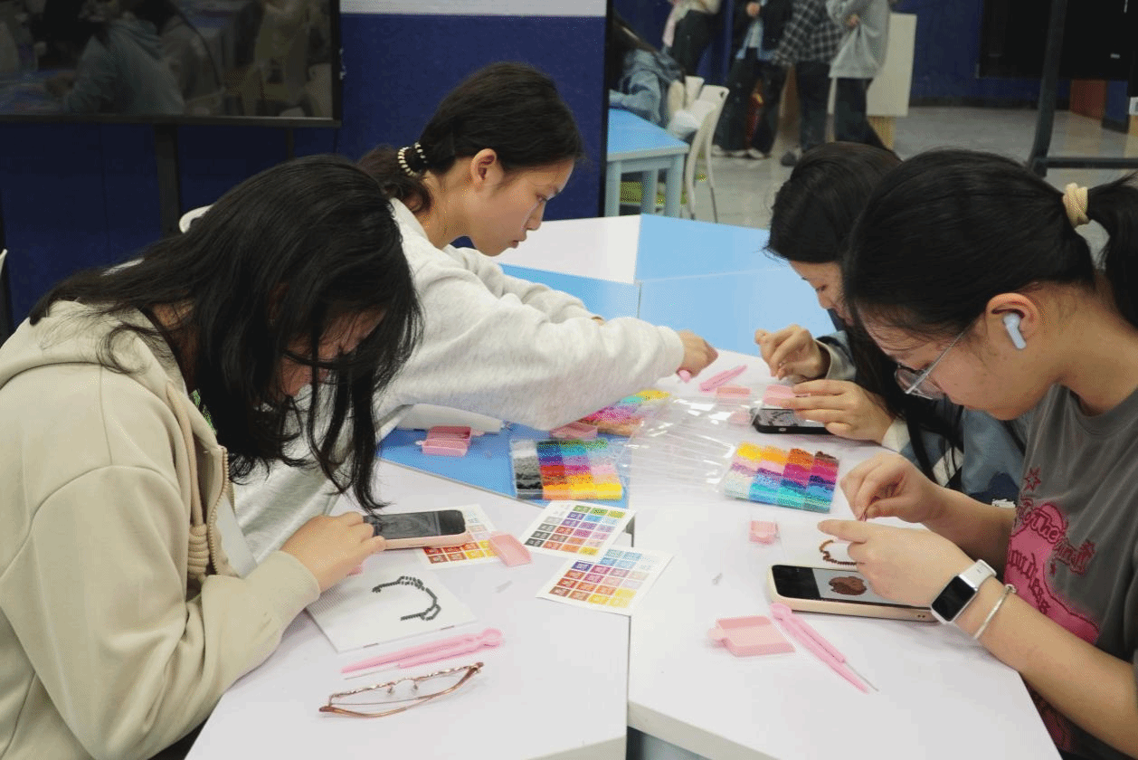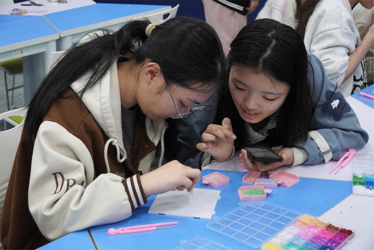 活动还特别设置了拼豆比赛环节。同学们以两人为一组分工协作,一人负责对照图案、把控细节,一人负责动手拼制,在规定时间内完成创作,比拼速度与精细度,现场气氛高涨。