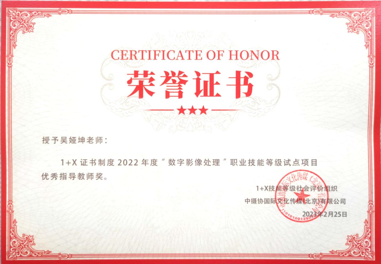 在近期召开的“1+X数字影像处理职业技能等级证书2022成果表彰会暨2023年工作线上说明会”上,我院被评为“2022年度1+X数字影像处理职业技能等级证书项目先进试点院校”,艺术传媒系董晴晴老师荣获“2022年度1+X数字影像处理职业技能等级证书试点项目楷模教师”称号,吴娅坤老师荣获“2022年度1+X数字影像处理职业技能等级证书试点项目优秀指导教师”称号。