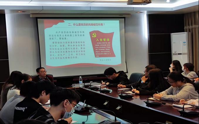 围绕什么是党员的先锋模范作用这一主题,陈政书记从党的性质宗旨、党员的权利和义务等方面分析了党员要发挥先锋模范作用的根源所在。陈政书记强调,入党就意味着要为党的事业做贡献,入党就意味着比群众多吃亏,入党就意味着比群众多挑重担,入党就意味着比群众多做牺牲。希望同学们一开始就要端正入党动机。
