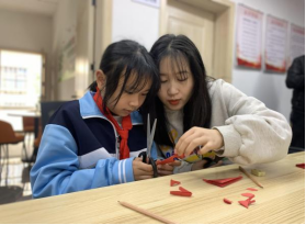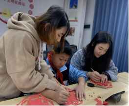 “小朋友小心剪刀,注意安全哦!”,“这个是边框里的字是“福”字,这个“福”字象征对幸福生活的祈祷和祝愿……”一句句温暖、轻柔的话语,回荡在金山塔社区的活动大厅中。在艺术传媒系党员先锋岗志愿者们的耐心指导和帮助下,小朋友们剪出了一幅幅漂亮的“福”字,展现了自己的学习成果以及对祖国的美好祝愿。