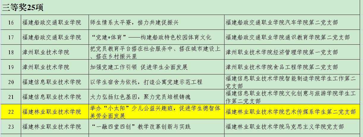 近日,中共福建省委教育工作委员会公示了福建省高校党支部工作“立项活动”优秀成果和“党员好故事、书记好党课、支部好案例”评选结果,评定高职高专院校党支部工作“立项活动”优秀成果40项,其中福建林业职业技术学院艺术传媒系学生第二党支部开展的《举办“小太阳”少儿公益兴趣班,促进学生德智体美劳全面发展》项目,获得党支部立项活动优秀成果三等奖。