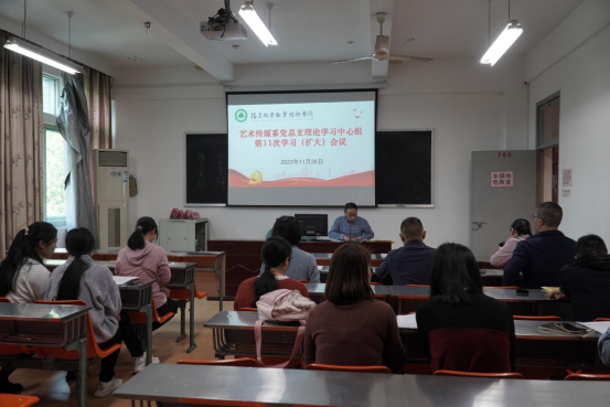 踔厉奋发担使命,勇毅前行谱新篇。为进一步学习贯彻习近平新时代中国特色社会主义思想和党的二十大精神,认真落实院党委关于政治理论学习的指示要求,11月26日上午,艺术传媒系党总支书记陈政在天麟校区综合楼705会议室主持召开艺术传媒系党总支理论学习中心组2022年第11次(扩大)会议,认真学习《中共福建省委组织部关于印发<深入推动全省基层党组织认真学习宣传贯彻党的二十大精神的若干措施>的通知》、习近平总书记考察陕西延安和河南安阳重要讲话精神、《中国共产党章程》、开展意识形态专题学习,围绕党的二十大报告中关于推进马克思主义中国化时代化的重要论述开展专题学习研讨、交流学习体会。系党总支委员、副科级以上干部、党支部书记、教研室主任参加了会议。