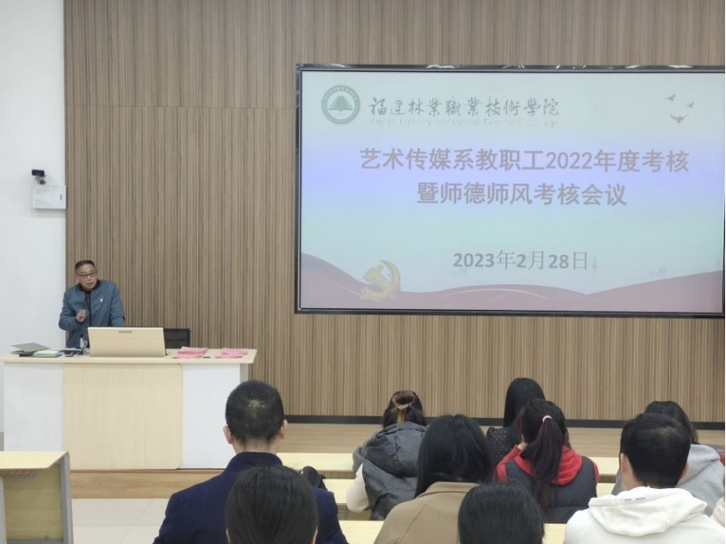 2023年2月28日下午,艺术传媒系于江南校区艺术楼旁阶梯教室召开教职工2022年度考核暨师德师风考核大会。会议由党总支书记陈政主持,全系在编教职工和非在编教职工均参加会议。