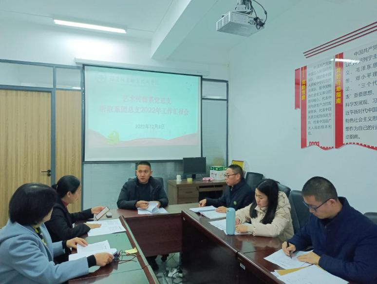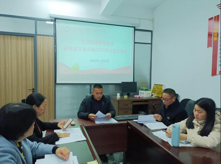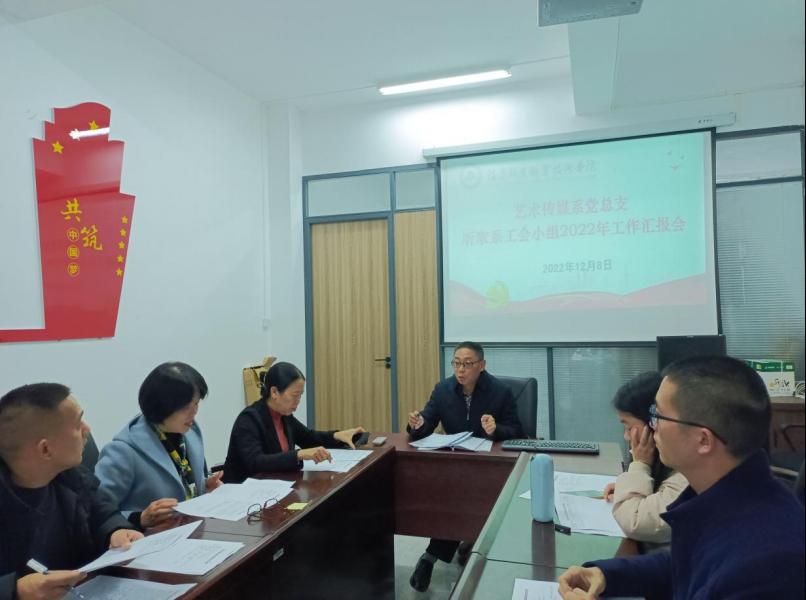 首先,廖士喜老师作为艺术传媒系工会联络员,就艺术传媒系工会小组2022年度工作情况向系党总支进行了汇报。2022年,艺术传媒系工会小组在学院工会领导下,通过全体工会会员的共同努力,围绕学院中心工作,加强教职工思想政治教育,扎实开展教育教学、管理和服务工作,积极组织和参加各类工会活动,增强了教职工的集体荣誉感、凝聚力和向心力,促进了系部的发展。艺术传媒系在2022年元旦春节团拜会暨文艺汇演中荣获“三等奖”;丁磊和廖士喜家庭分别被评为“五好家庭”、“最美家庭”;成功开展了艺术传媒系女教职工“三八”妇女节踏青活动、教职工春游和秋游活动;徐豪、丁磊组合在工会组织的“诵读中国”经典诵读比赛中获得第一名,胡静婷、宋慧敏组合在工会组织的“诵读中国”经典诵读比赛中获得第二名;艺术传媒系在学院举办的“教工三人篮球赛”中荣获三等奖。