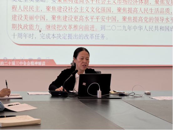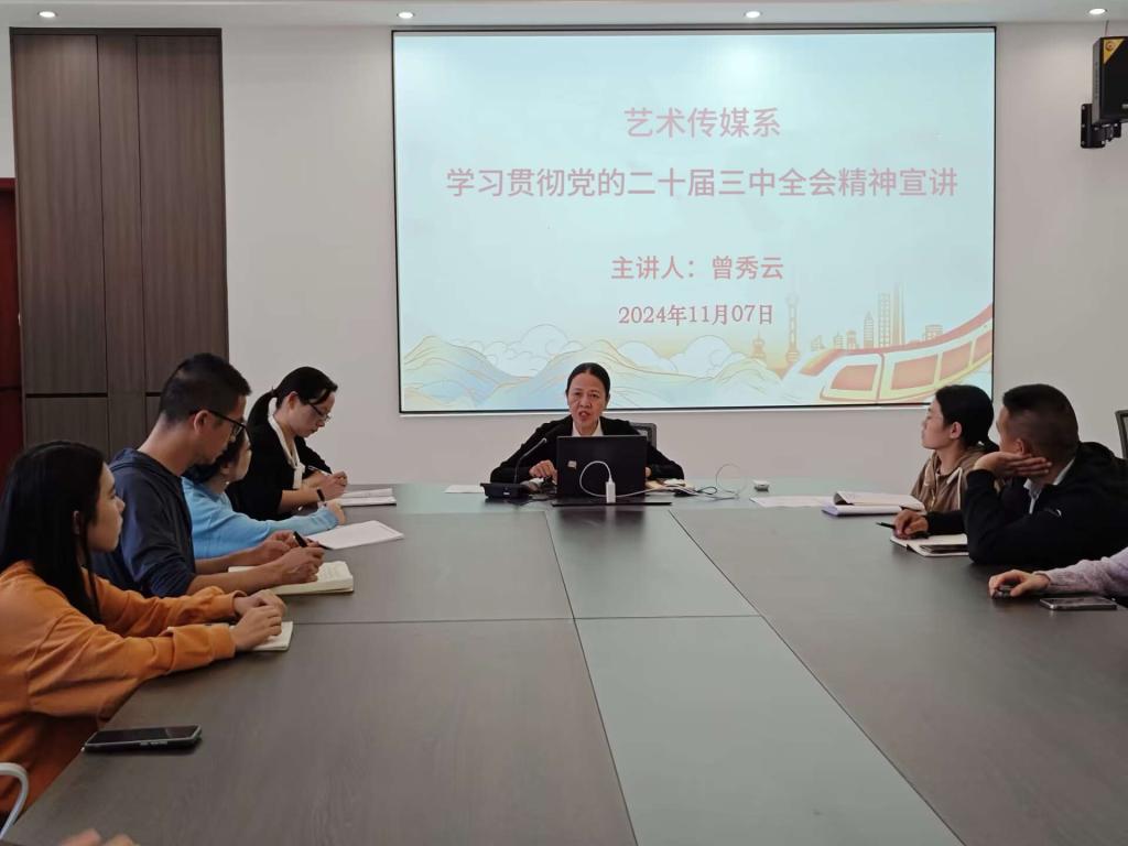 为深入学习贯彻党的二十届三中全会精神,领会进一步全面深化改革、推进中国式现代化的重要意义,2024年11月7日下午三点,艺术传媒系于艺术楼四楼会议室组织学习贯彻党的二十届三中全会精神宣讲。本次宣讲由艺术传媒系党总支书记兼主任曾秀云主讲,全体教职工参会。