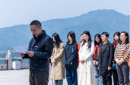 在革命烈士纪念碑前,全体师生默哀三分钟,向革命先烈致以无限敬仰和无尽哀思。艺术传媒系党总支书记范有福宣读《烈士祭文》,教师代表欧阳昭勇,学生代表周文杰相继发言。师生们肃然站立,静默瞻仰烈士纪念碑,追思烈士英勇事迹,展现出浓厚的爱国之情。