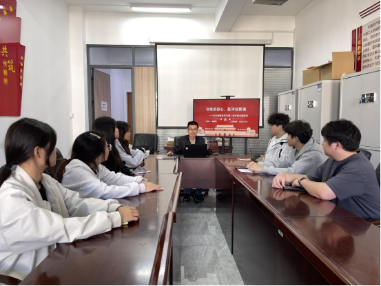 “组织永远是大家最坚实的后盾。”在组织帮扶环节,支部书记路雨霏向全体党员明确服务保障举措。党员在备考、实习期间若遇到复习压力过大、加班超时、实习协议纠纷、生活房租压力等问题,可随时联系辅导员或支部书记,心理老师、就业老师将第一时间提供针对性支持,为党员排忧解难。