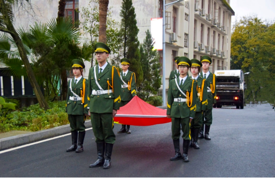 主持人宣布升旗仪式正式开始后,国旗护卫队的同学们迈着整齐划一、铿锵有力的步伐护送着五星红旗走向升旗台。随着雄壮激昂的《义勇军进行曲》响起,护旗手振臂一挥,转动旗绳,全体师生们庄严肃立,注视着鲜艳的五星红旗在熠熠晨光中冉冉升起。