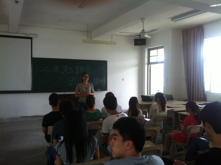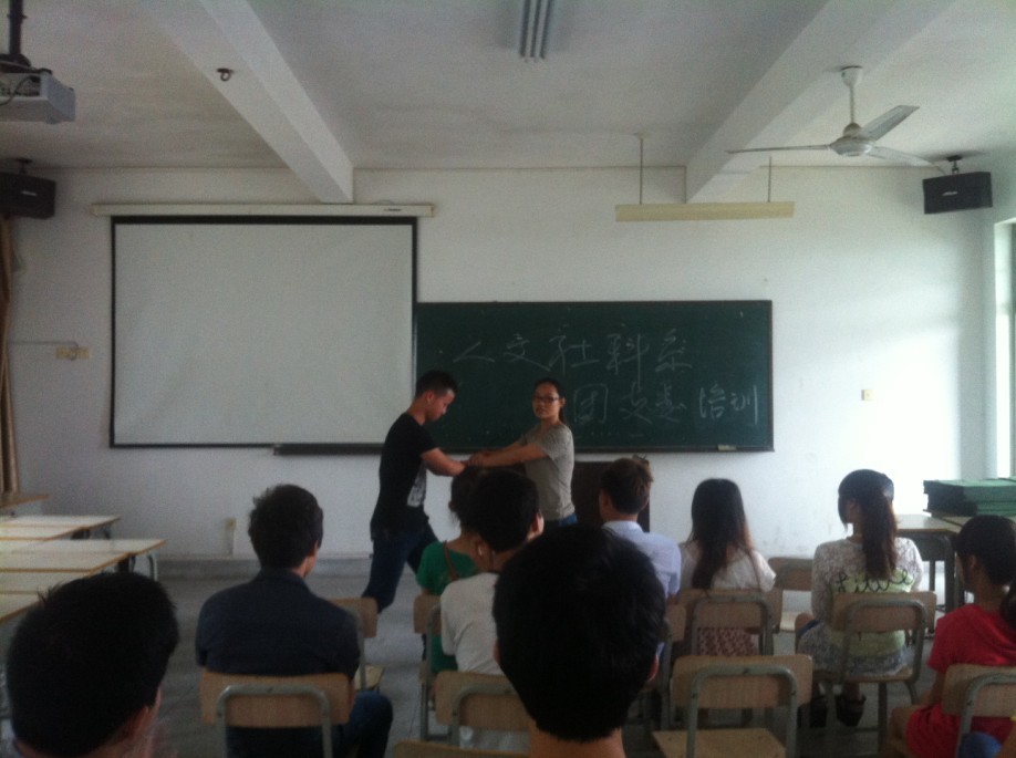 2013年6月13日下午16:20分,人文社科系团总支书记陈红英老师在教学楼505开展了人文系团支委培训活动。本次培训旨在让我们更好的认识自己,要对自己充满自信,同时相信队友。