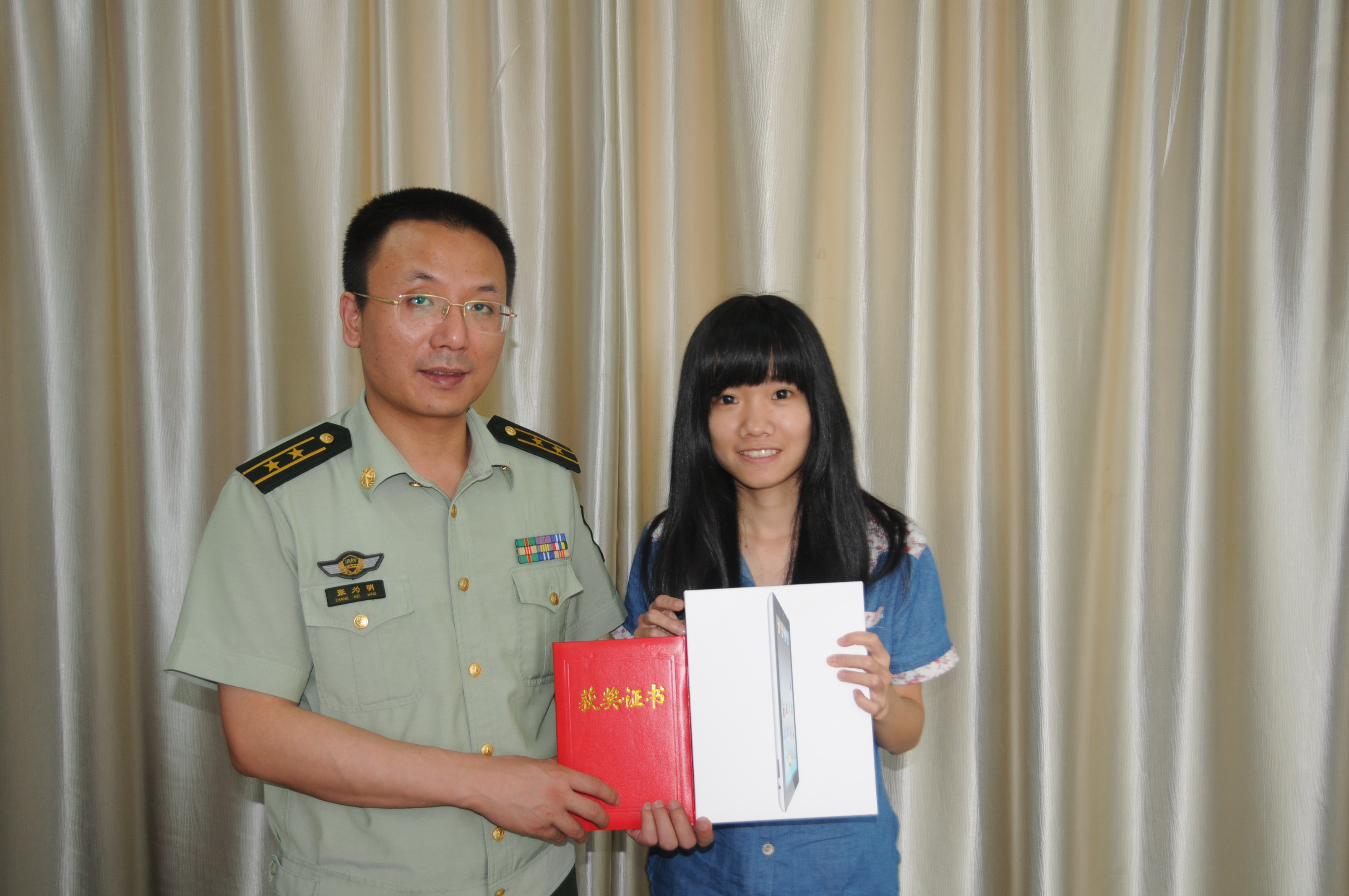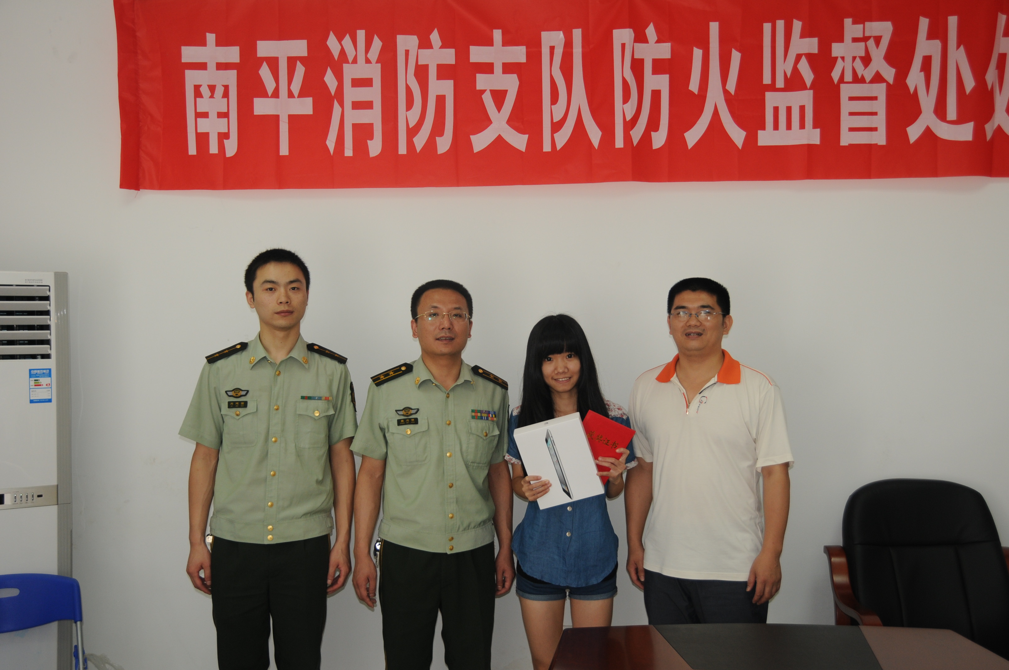 6月7日,南平市公安消防支队举行“平安.消防”海报设计大赛颁奖仪式,消防支队防火监督处张为明处长向大赛一等奖获得者——福建林业职业技术学院人文社科系2010级广告班蔡美玲同学颁发了奖品和证书。