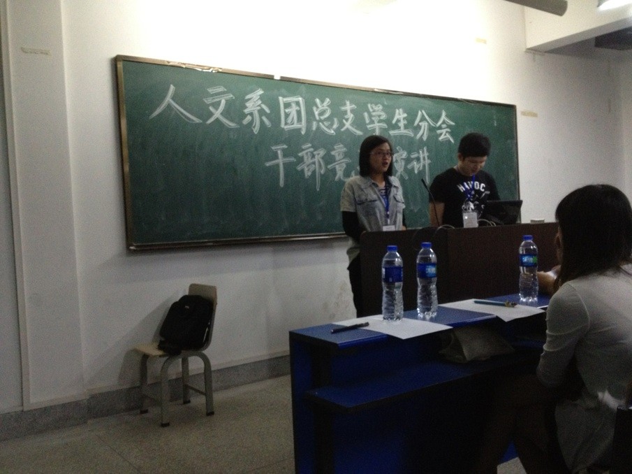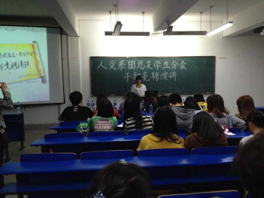 2012年10月23日晚,我院人文社科系在科学楼602开展本学期的团总支学生分会干部竞选演讲大赛。本次的竞选席位包括团总支办公室主任、学生分会主席、各部门部长、副部长,此次竞聘演讲由团总支办公室主任林冬梅和学生分会主席曾一泓担任主持,人文系党总支副书记谢福荣老师、团总支书记陈红英,以及团总支学生分会现任学生干部担任评委。