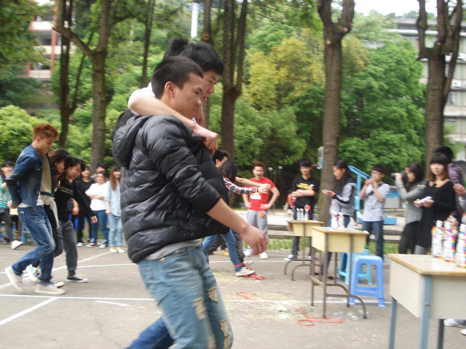 下午14:30分,活动拉开了帷幕。最让同学难以忘怀的是“瞎子喂蛋糕”,游戏规则为:成员A带着眼罩坐在桌前(终点),成员B手持蛋糕指引带着眼罩的成员C从起点到终点,并从成员A背后喂其吃蛋糕,淘汰时间最长一组。整个场面惊心动魄,又是喧哗、又是高呼,摄影组的争先拍下这场面。在长达一个多小时,终于来到最能挑战参赛者的肺活量-----吸雪碧,顾名思义为每组各有3杯雪碧,要求组员从起点跑到终点,一个接着一个用吸管吸完,时间最短的三组获胜。