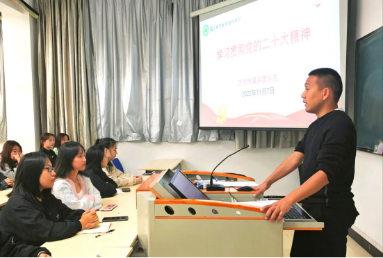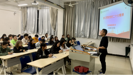 为了深入学习贯彻党的二十大精神,加强团员信念感与使命感,2022年11月7日晚上七点,艺术传媒系学生科科长兼团总支书记廖士喜在江南校区教学楼205教室召开团员大会,讲授《党的二十大报告要点》专题团课。艺术传媒系团员学生参与本次学习。