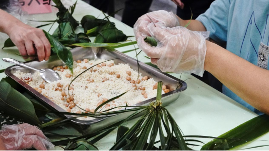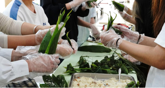 同学们个个劲头十足,在食堂阿姨的指导下,挑粽叶、折粽叶、填糯米、放料陷、裹叶子、扎粽绳,动作逐渐娴熟,一张张粽叶在大家的手中翩翩起舞,一双双巧手不停忙碌。转瞬间,大家包出了一捆又一捆的粽子,一个个形态美观的粽子呈现眼前。现场欢声笑语、气氛热烈。大家一起边包粽子,一边谈论端午节的起源、传说,处处弥漫着粽叶的清香,洋溢着端午节的欢乐氛围。